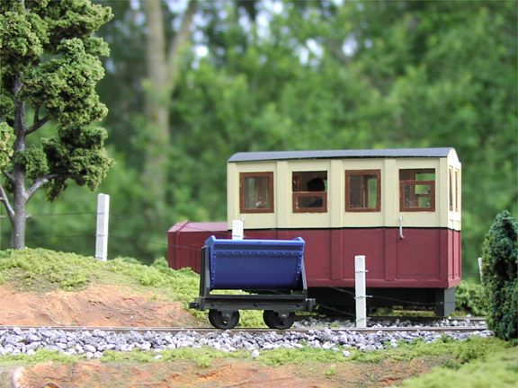 The Railcar heads out past a solitary tipper wagon waiting in the siding