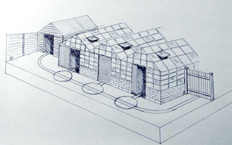 | The four greenhouse version just didn't work for me when I expanded the design. But I still thought there was something there. So I took a greenhouse out and added a run through shed at the end. Perhaps this could be a recharging station/workshop for the HAWE's. This shed serves to hide the circular nature of the trackplan very well. It is also stepped back from the greenhouse fronts to add some depth to the model. I have to say that I really do like this larger version of the plan. Three greenhouses to me, seems to be the right amount. I've drawn each doorway with a different door for variety and I think that the shed at the end as a scenic exit is a different feature. |