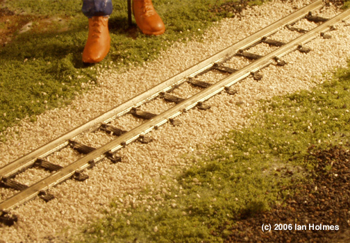 Do Gnine trains need any special track to run on?Far from it. You can run Gnine trains on ordinary N gauge track. Beleive it or not but Standard N gauge track sleepers scale up very favourably against the sleepers on full size miniature railway track. One thing that you will notice when comparing actual miniature railway track with N gauge track is that the sleepers are set further apart. This can be very easily rectified by removing every other sleeper in a section of track. Just snip them out with a pair of thin nosed wire cutters and file any rough bits down.Below is a picture of a sample section of track. This is a very simple modification that only takes a few moments but makes a lot of difference to the finished apearance. |
