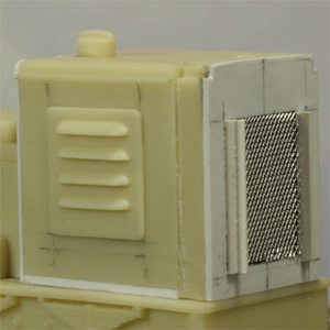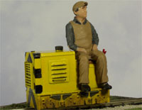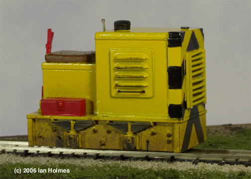 model to have that type of grille. So to the grille, by turning the radiator casting around so that the cast grille details are inside the engine housing you are left with a flat surface to build the new grille onto. Interestingly these details help to locate the radiator in the right place. Firstly I cut 2 pieces of .020 styrene sheet to the same size as the front .I cut a hole in one to take a piece of my standard grille material aluminium mesh. and then fsandwiched the three pieces together in place on the reversed radiiator piece. Some 2mm styrene angle was placed either side of the mesh and some 1.2mm rod was cut to length and stuck between the angle. Another thing I wanted to do was raise the height of the engine cover slightly so that it was flush with the top of the radiator. This was achieved by adding a strip of 1mm styrene anound the bottom of the engine compartment. I also had to cut a new .020 styrene bonnet backplate to match the new height. Those were the only alterations to the model. You can see in the picture on the right here those pieces that were added from styrene.Painting was another area that I thought I could make my model different. The last thing I was going to do was paint it Green. I've seen far too many Green locos. I'm fond of my Yellow Gn15 loco's so I thought Yellow with Black warning chevrons would be the perfect livery for it. Yellow can be a difficult colour to paint at the best of times and even tough I cleaned the loco thouroughly and primed it my first effort brush painting was stripped off and I opted for a spray painting. A better, though not perfect finish. The chevrons were marked out with a Black lining pen used for automotive kit detailing and then filled in with a testors Black paint marker. Marking the chevrons out on such a small area was a bit tricky. The footlplate tool box was picked out in red as were the tops of the control levers. Then with a bit of light weathering, She's almost ready to go. I'd really like to add nameplates to her. But where to fit them on such a small body? |