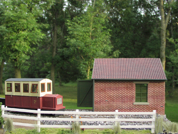 The railcar by the small goods shed at the right hand end of the layout. The trees in my back yard work well with the model.