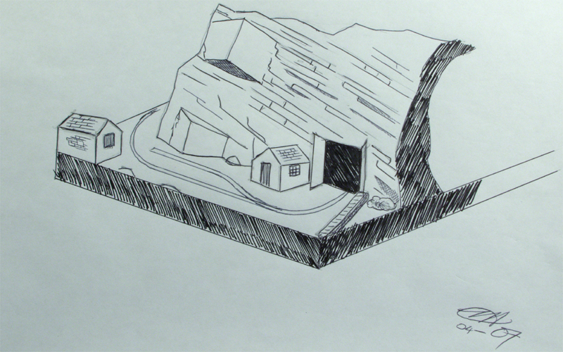 | The entrance to the cavern. Slate mines are immensely popular subjects for narrow gauge model railway layouts. I hope this concept gives you the idea to approch the subject in a different way. They are spectacular places and a good study of how the strata of the rocks lie would pay dividends in the display of this model. I even drew a siding in outside the cave entrance so a train going in could wait for one coming out. |