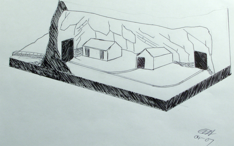 | The cavern interior. Unless you've actually been in a slate cavern you won't understand how reaaly big they can be. They are quite capable of storing large brick built buildings. I've shown a feeder line going in to one of the stores. If anyone was to contemplate building a similar model tehy should perhaps consider the smaller scales that way you could really get the feel for the size of a cavern. |