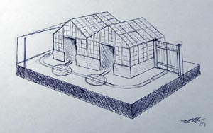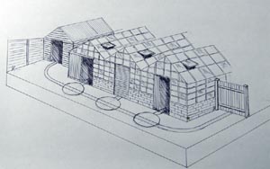 produce. As for the greenhouses themselves. I've envisioned this as perhaps an older section of the nursery where these brick based greenhouses have more character than the huge modern structures. But that's just my opinion. Also it is perfectly possible to add to the amount of greenhouses on the model I just drew 2 as a starting point. If you really believed in the idea you could go for three or even four of them, maybe even more. Intrigued by by that idea I developed a plan with 4 greenhouses but I didn't like that but undeterred I developed another design which you can see below that I am very happy with. |