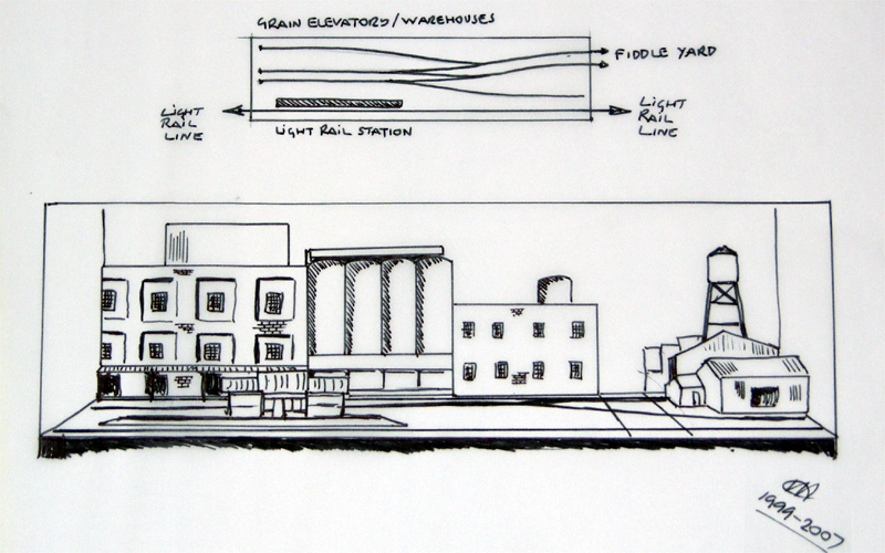 | HIAWATHA If you've looked through the whole of iholmes.com you'll have checked out my photogallery of the Metro transit light rail. If not it's in the inspiration box.. Hiawatha is an idea that incorporates light rail and modern American switching. As many of you haven't ridden the Hiawatha line you won't know that for several miles alongside Highway 55 the line parallels many grain elevators and warehouses all rail served. So the idea behind this layout is plain and simple big grain elevators and warehouses as the backdrop for the layout where you can switch cars to your hearts content then in front of that a light rail line periodically shuttles past stopping at the station before moving on. This part of the model could even be entirely automated. As the angle that I originally sketched this in gives you no clue as to the track layout I've added a little sketch above. But as usual, no sizes, |