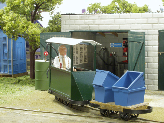 | Another view of the old locomotive with a wagon load of empty cases. The semicircular buffer bar on the end of the wagons help them go around the 6" radius curves. Eagle eyed viewers will note that this is an old view of the layout as smokers corner has yet to replace the tree and porta-loo. |