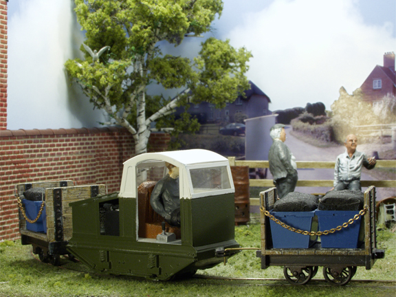 | I like this view too. Here you get a good view of the watercress cases (scratchbuilt form styrene sheet) complete with bagged cress (shaped bits of pink foam covered with painted tissue). Also clear is a coupler bar that I use to get the wagons to go around the six inch radius curves with out derailing. The curly spoke wagon wheels (a particular favourite feature) are shown off to good effect too. |