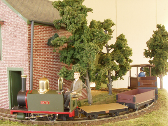 Katie rounds the sharp (six inch radius) curve from the rear of the layout. Such sharp curves are not a real problem for short 4 wheeled stock like these. The Loco and wagons are scratchbuilt bodies on commercial running gears.