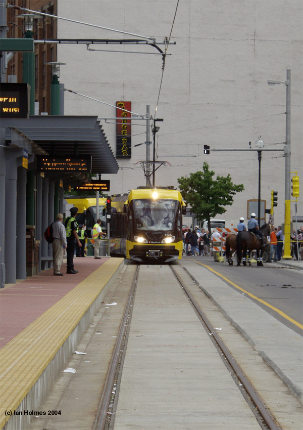 Car 113 enters the warehouse district station. I'm getting on this one. The queue to board the tram now extends around 3 city blocks and out along 5th street