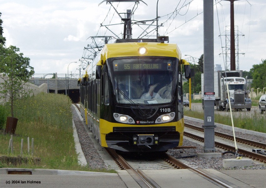 Car 110 arrives at 50th Street on its way south to Fort Snelling